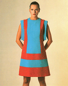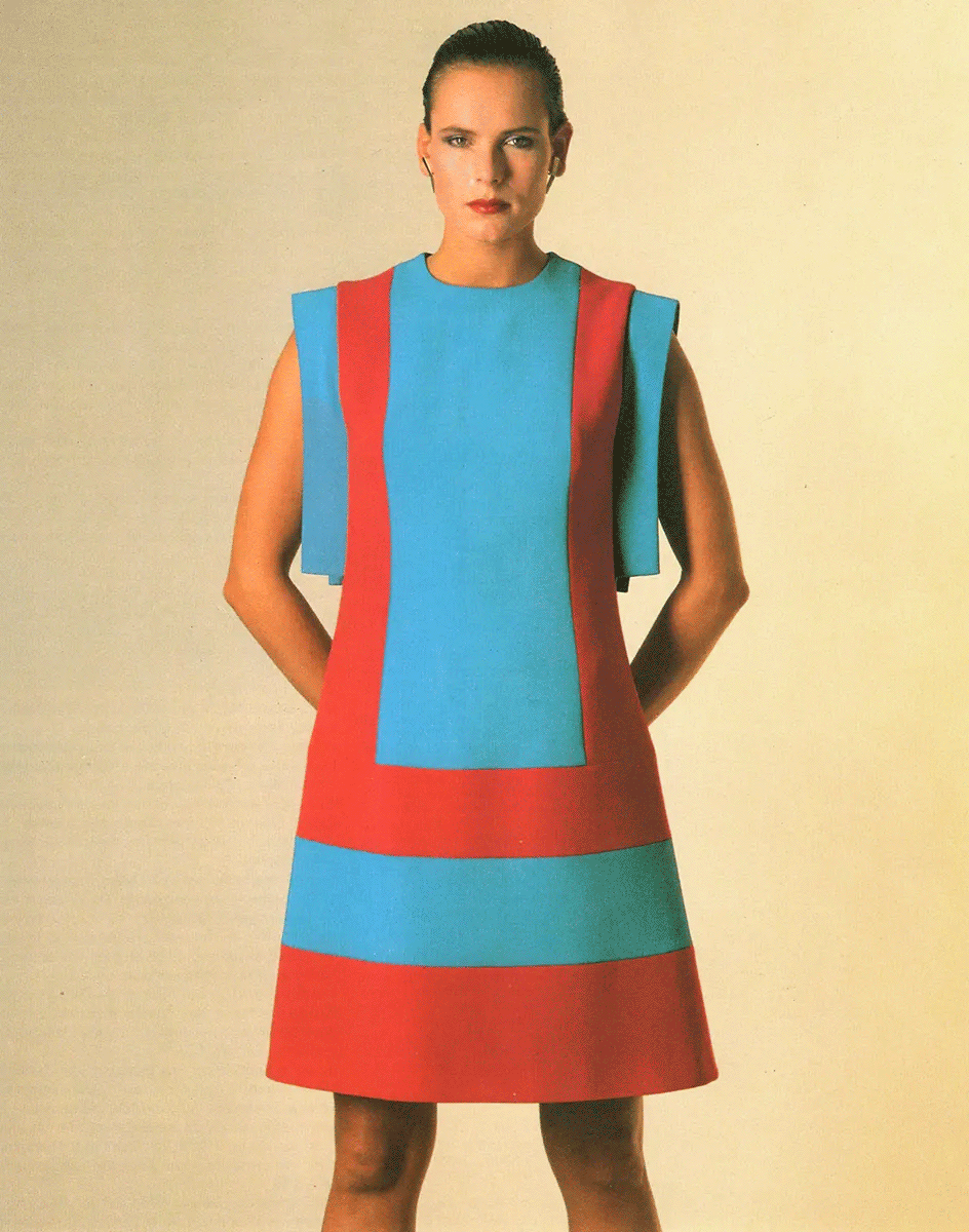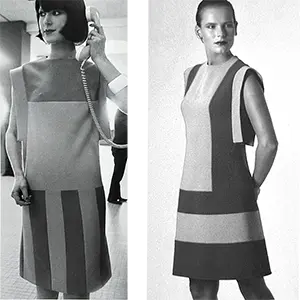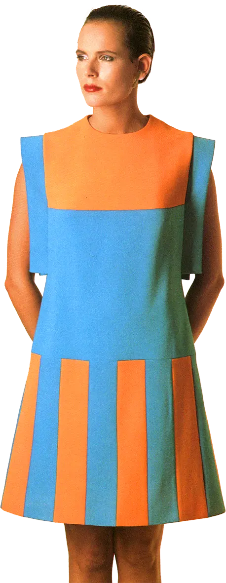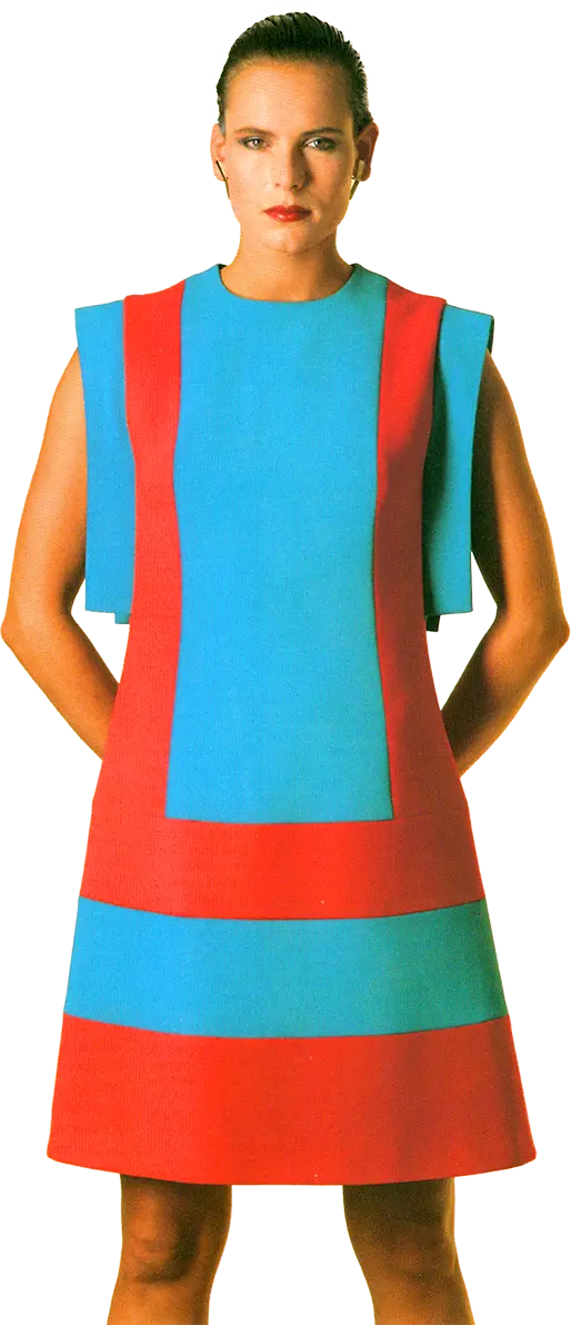 With a nod to the Parisian designer Yves Saint Laurent, who designed a Mondrian dress in 1965, Frans Molenaar is inspired by the colorful abstract-geometric compositions of visual artist Bob Bonies. Molenaar translates Bonies' geometric shapes and bright color contrasts into fabric as precisely as possible. These form experiments, in luxurious, often double-woven couture fabrics from Paris, lead to the so-called 'Bonies dresses' in 1972.