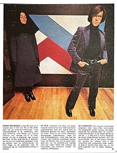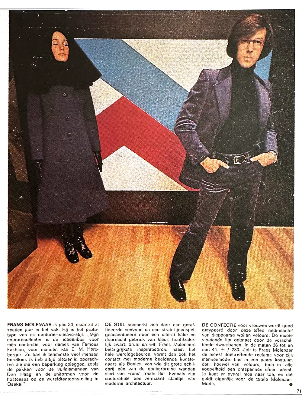 With a nod to the Parisian designer Yves Saint Laurent, who designed a Mondrian dress in 1965, Molenaar is inspired by the colorful abstract-geometric compositions of Bonies, which are in line with the ideas of the De Stijl movement. Bonies exhibits his works in the avant-garde gallery of Riekje Swart on Amsterdam's Van Breestraat, where Molenaar was a regular. In 1970 he was photographed in his own apartment for the weekly magazine Margriet. The couturier poses in front of a work by Bonies with blue and red diagonals that he says he purchased 'instead of an Appel'.