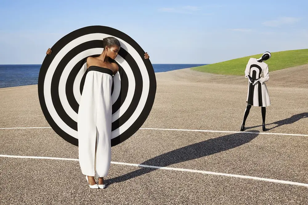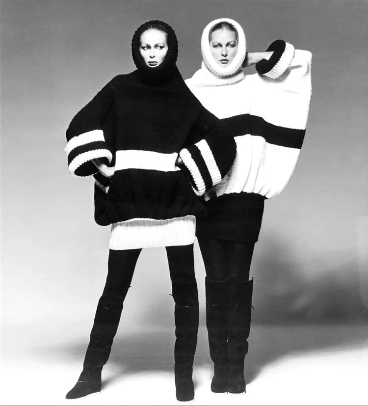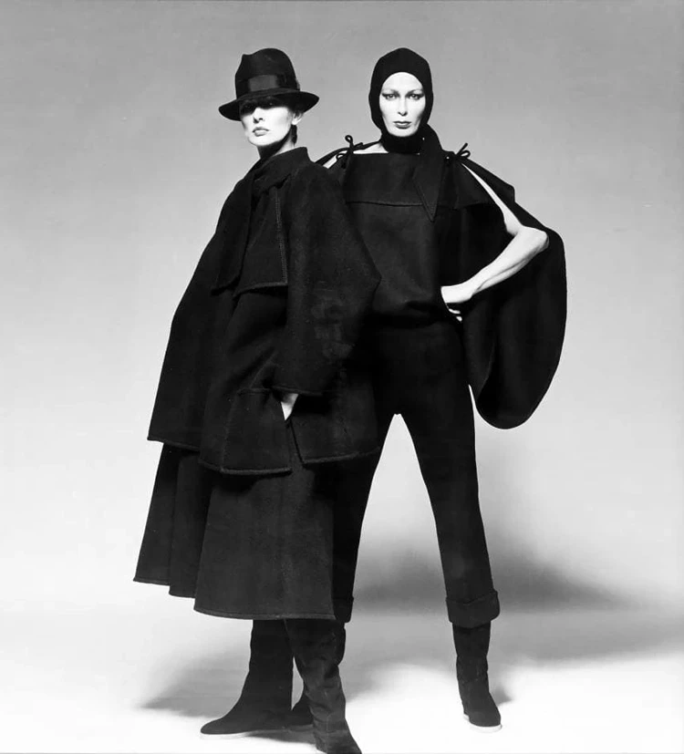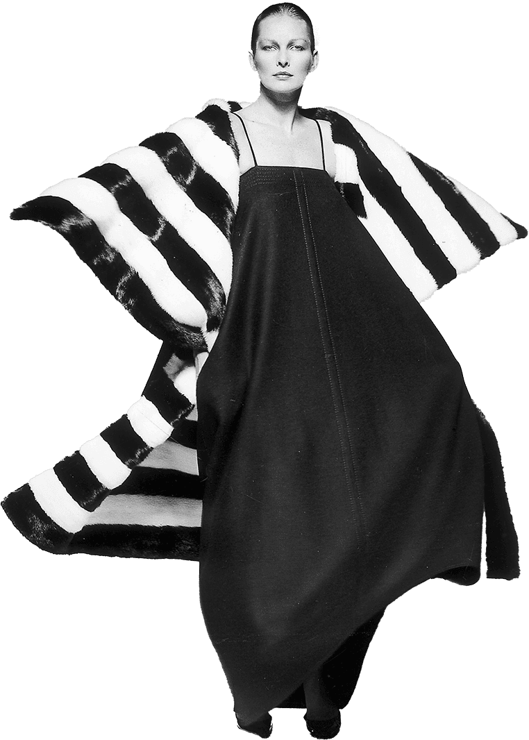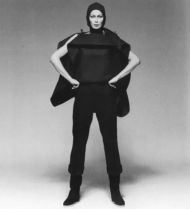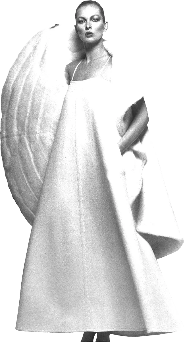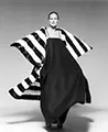 The black-and-white circular cape from 1977 is iconic Molenaar: graphic, monumental, and sublimely constructed. He uses geometry as form and as a statement. What appears as architecture on the catwalk becomes fluid and soft on the body – an exercise in contrast and control.