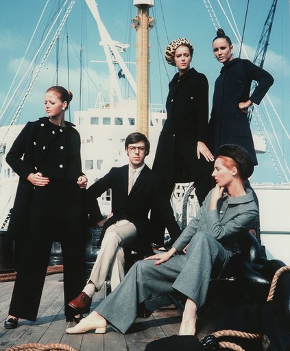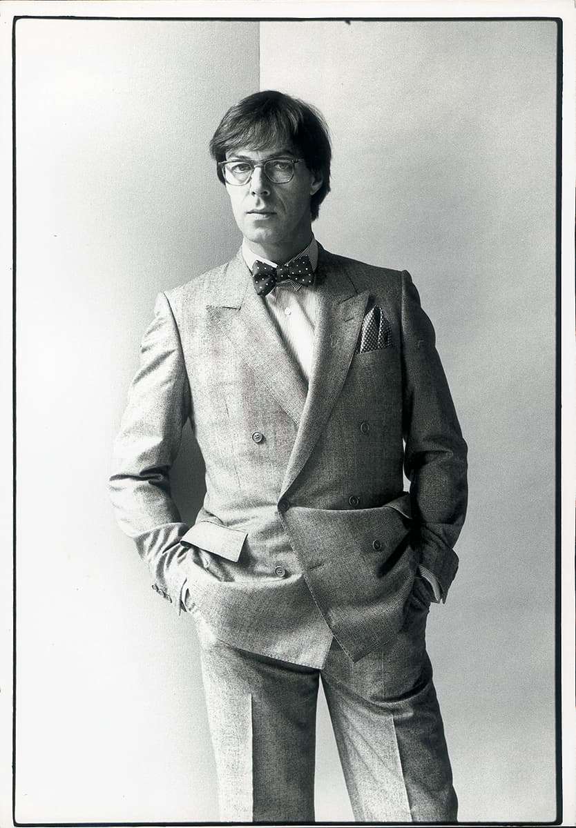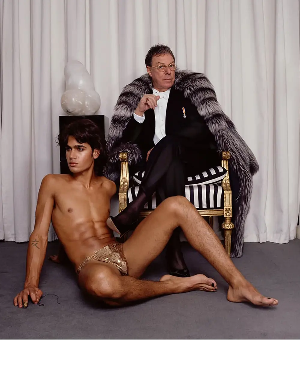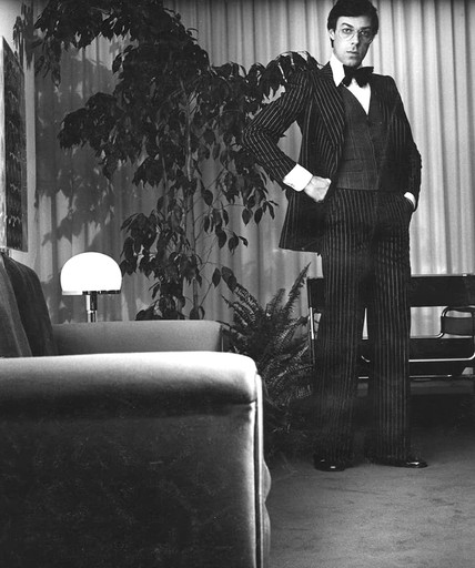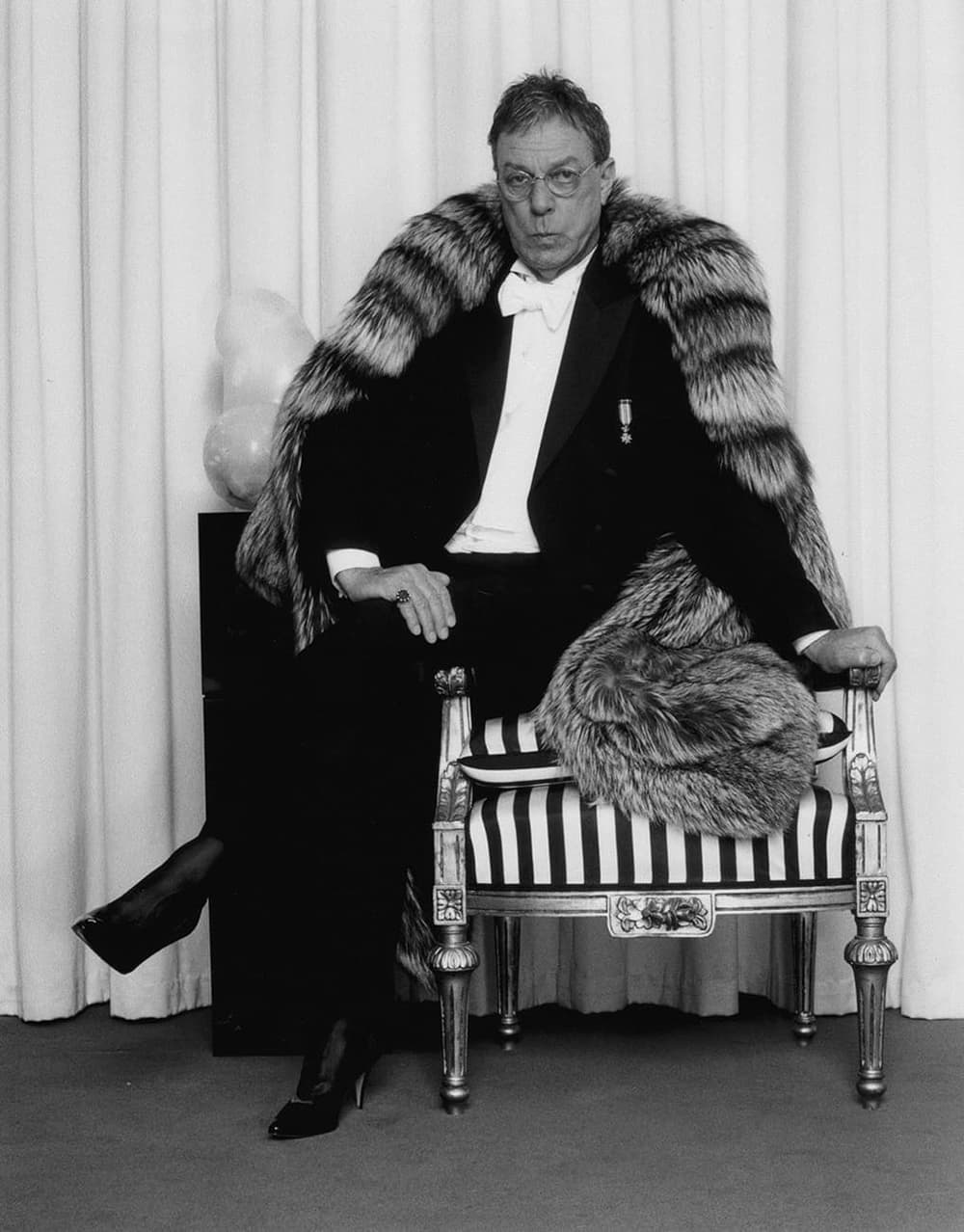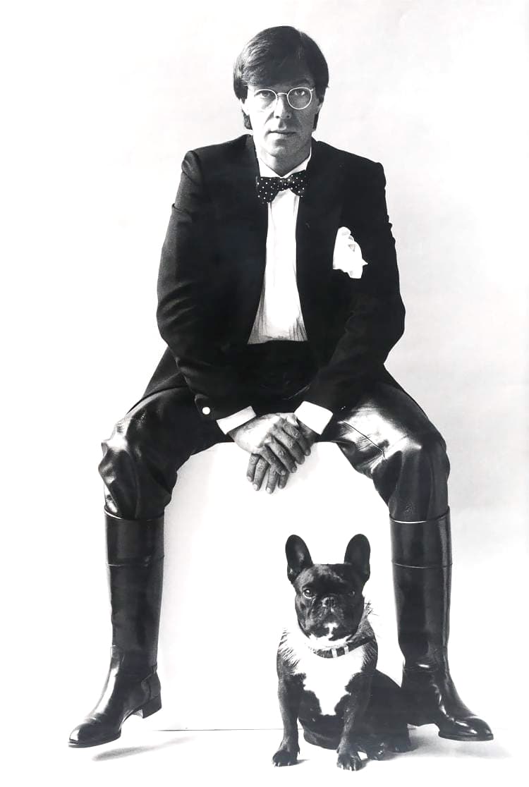Through the years he is often portrayed himself, images that only seem to underline his self-proclaimed status as fashion king. Always recognizable as a stylish couturier and sometimes with the necessary bravado, through tantalizing details such as patent leather boots, his French bulldog Coba or pumps with stiletto heels.